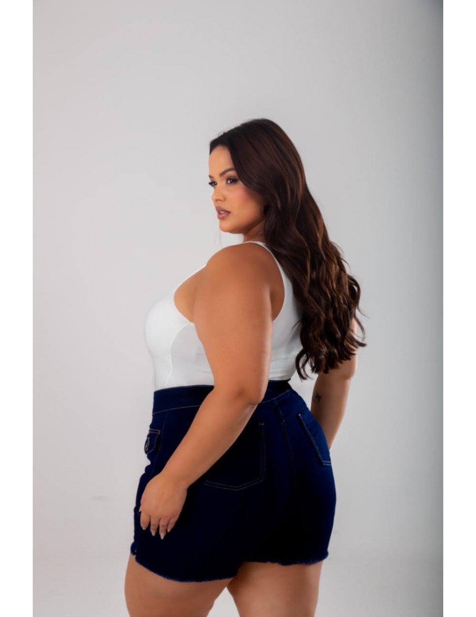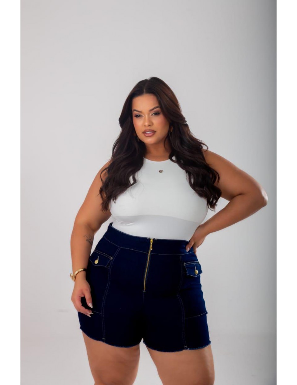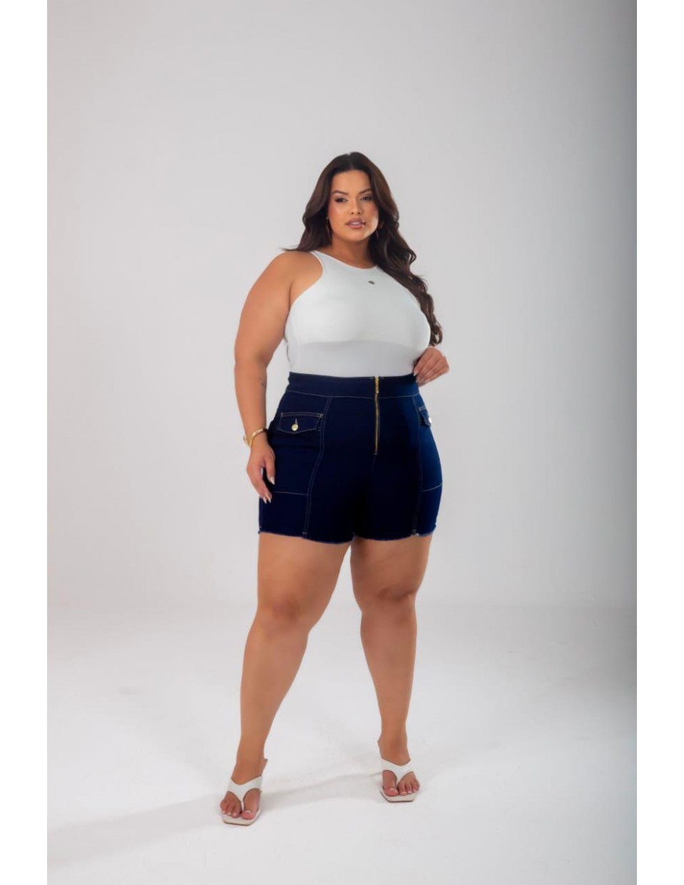 Short plus size jeans escuro cargo com lycra, com cintura alta, com 2 bolsos cargo na frente, com detalhes em costura na frente, com zíper com pingente na frente, com 2 bolsos atrás e com barra desfiada.